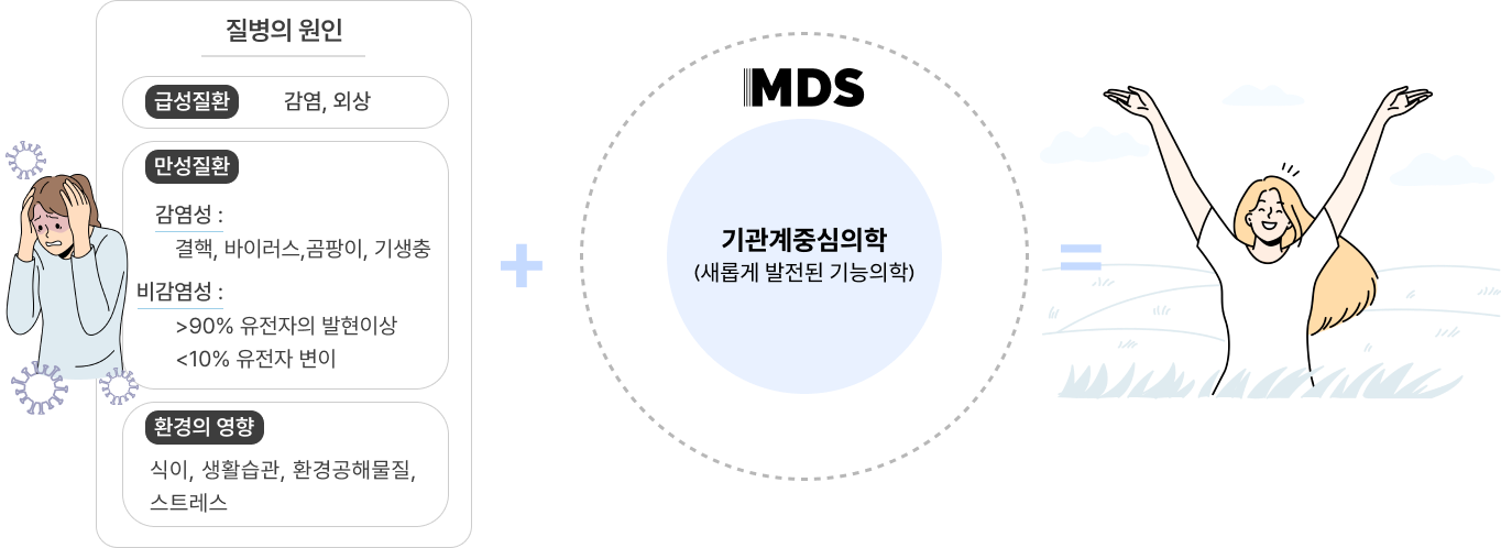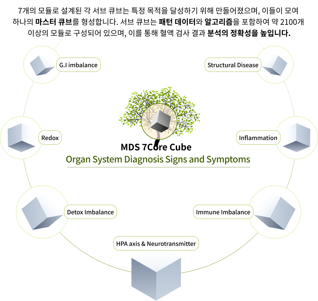 MDS 솔루션은 기관계중심의학을 적용한 다면적 접근법(7Core Cube Engine)을 통하여 핵심 이념인 질병의 근본적 원인을 정밀하게 규명하고, 이에 대한 해결책을 모색함으로써, 각 개인에 맞춤화된 치료 전략을 제공합니다.