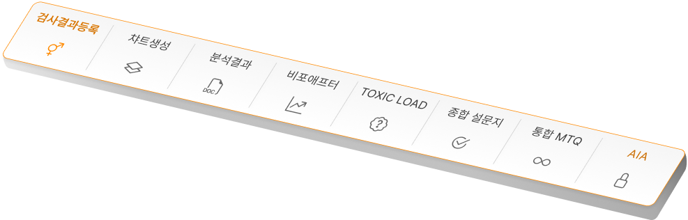 MTQ는 MDS 솔루션의 핵심 분석 모듈로, 개별적인 MDS, Toxic Load, 설문지 데이터를 통합하여 환자의 건강 상태를 포괄적으로 분석하고, 의료 전문가에게 환자 진료에 필요한 정보와 환자 맞춤형 건강 계획 및 치료 전략 수립에 중요한 역할을 합니다.