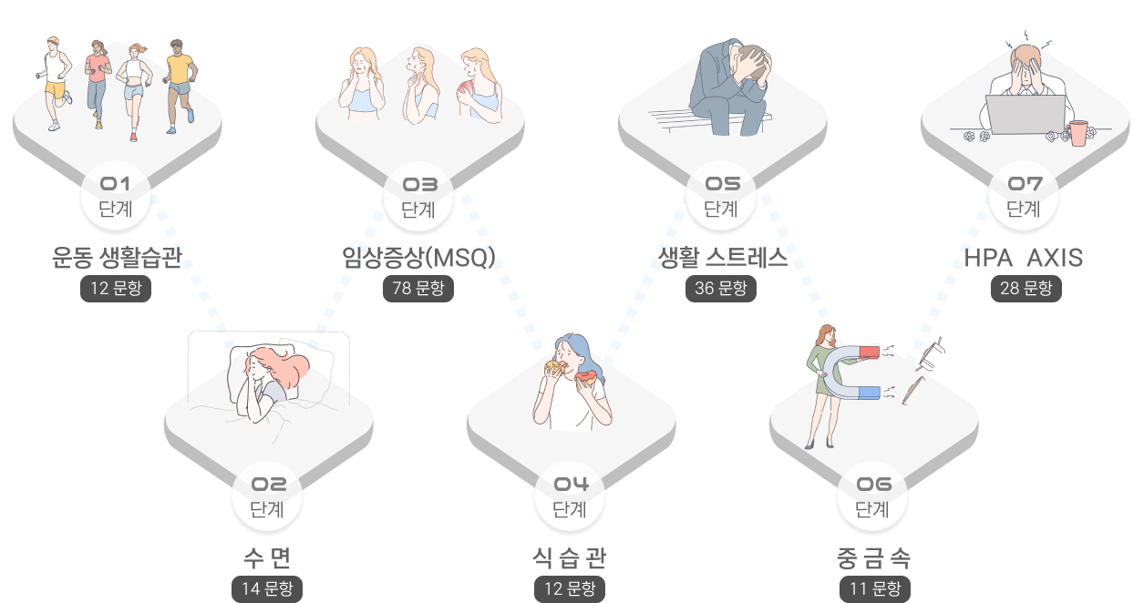 7Core 알고리즘과 빅데이터를 기반으로 병력 및 설문지 정보를 결합해 질병 및 증상의 선행 요인을 분석합니다. 추가 검사를 권장하며, 건강 회복과 웰빙을 위한 방향을 제시합니다. 체계적 분석으로 만성 질환의 메커니즘을 파악하고, 맞춤형 치료 및 예방 전략을 제공하여 삶의 질을 개선하고 의료비를 절감합니다.