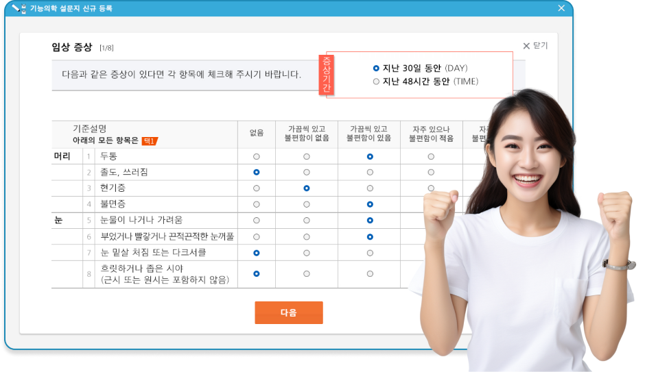 설문 내용에 따라 여러 증상에 대한 질문 입니다.