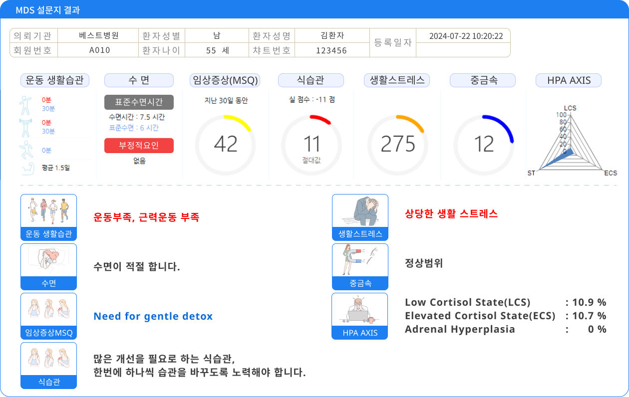 MDS 설문지를 통해 환자와 의사는 중요한 건강 정보를 쉽게 이해하고 활용할 수 있습니다. 이 설문지는 환자의 생활습관, 수면, 임상증상, 식습관, 생활 스트레스, 중금속 노출, HPA 축 기능 등을 종합적으로 평가합니다. 이를 통해 환자는 자신의 건강 상태를 자세히 파악할 수 있으며, 운동 부족, 높은 생활 스트레스, 식습관 개선 등 구체적인 개선 방향을 알 수 있습니다.
